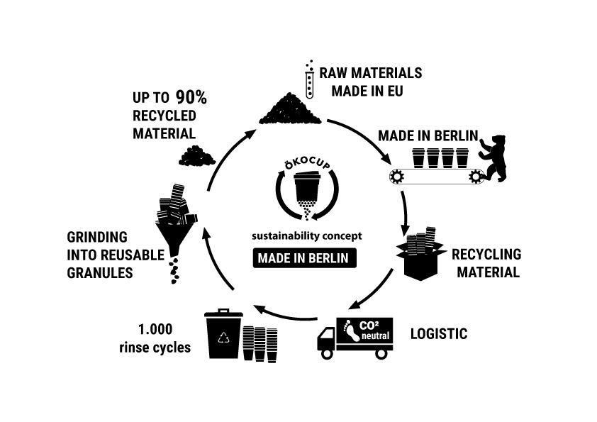 ÖkoCup is een oer-Duits kwaliteitsmerk dat wordt geproduceerd in Berlijn. De duurzame drinkbekers en deksels zijn gemaakt van een hoge kwaliteit BPA-vrij en melaminevrij polypropyleen (PP) dat geen geur of smaak afgeeft. Deze gecontroleerde grondstoffen komen uitsluitend van leveranciers binnen de EU.