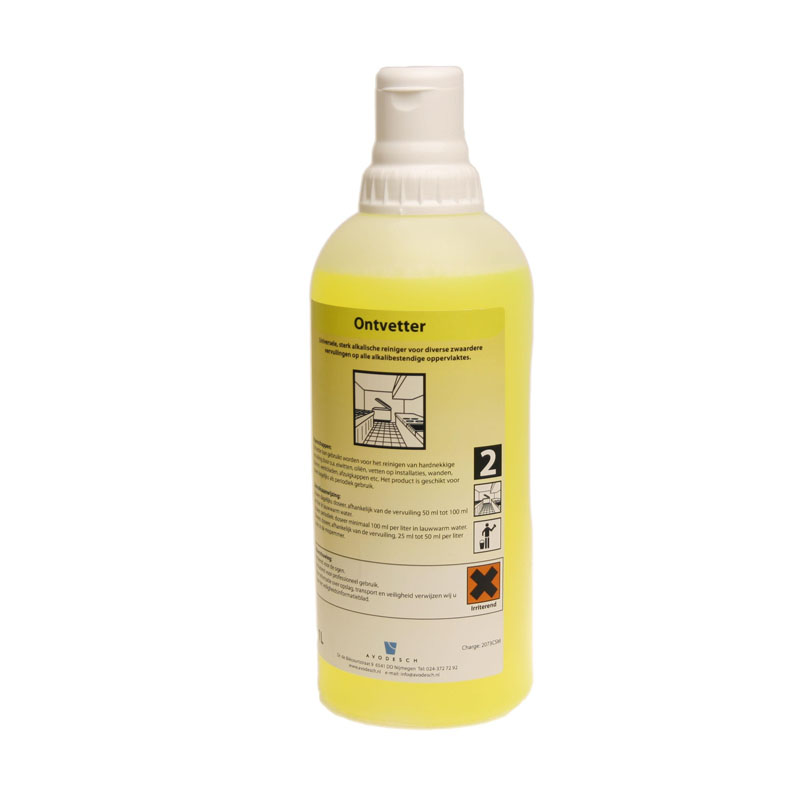 De Avodesch Ontvetter is een universele, sterk alkalische reiniger voor diverse zwaardere vervuilingen op alle alkalibestendige oppervlaktes. Het product is geschikt voor zowel dagelijks als periodiek gebruik.