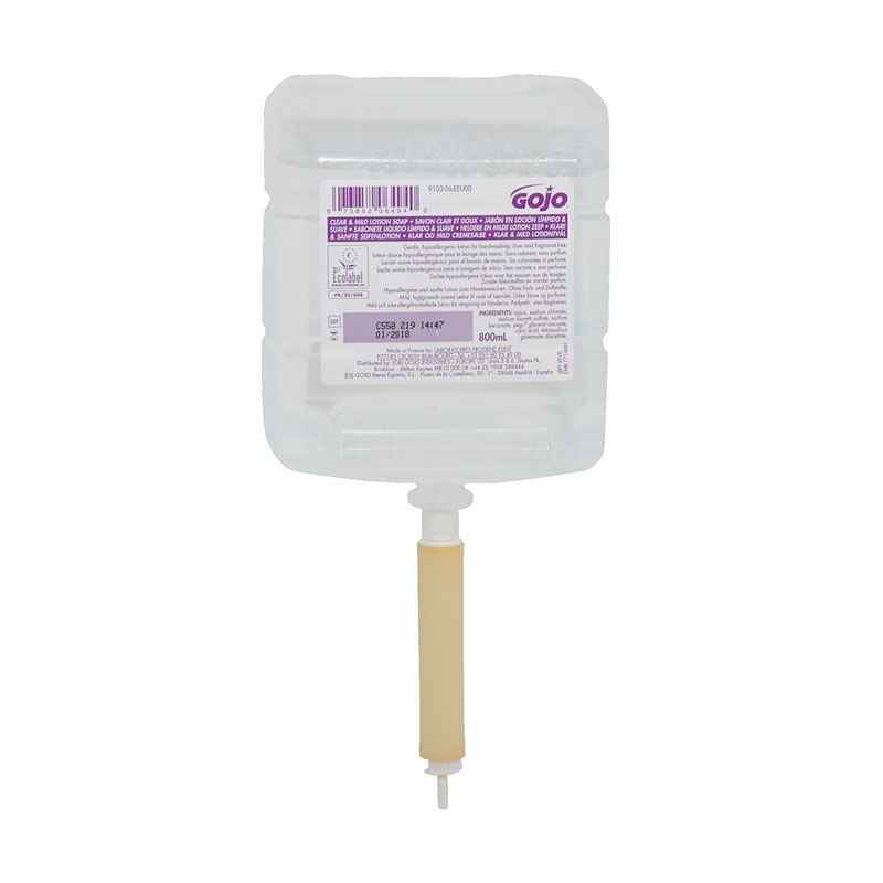 Deze milde handzeep is de ideale handzeep voor dagelijks gebruik. Deze vloeibare handzeep is transparant en volledig vrij van parfum. De Gojo handzeep mild zit verpakt in een doos met 6 bag-in-box verpakkingen van 800 ml. De zeep is voor het algemeen gebruik en voelt zacht aan. De Gojo handzeep is vrij van parfum. Deze handzeep past in de witte en zwarte kunststof bag-in-box dispenser.