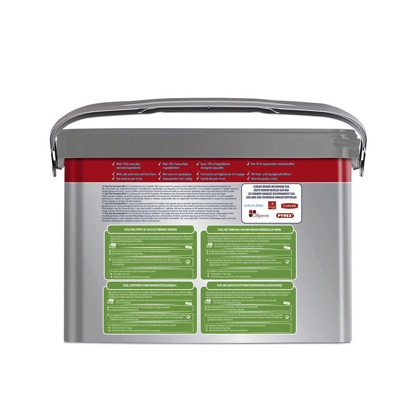 Sun Pro Formula Vaatwastabletten Alles in 1 is een complete oplossing met ingebouwd glansspoelmiddel en zoutfunctie. Glansmiddel voor uitzonderlijke glans en zout om kalkaanslag te voorkomen. Verwijdert vet en hardnekkige vlekken, zoals koffie, thee en lippenstift. Zorgt voor sprankelend schone kopjes en serviesgoed bij elke wasbeurt.