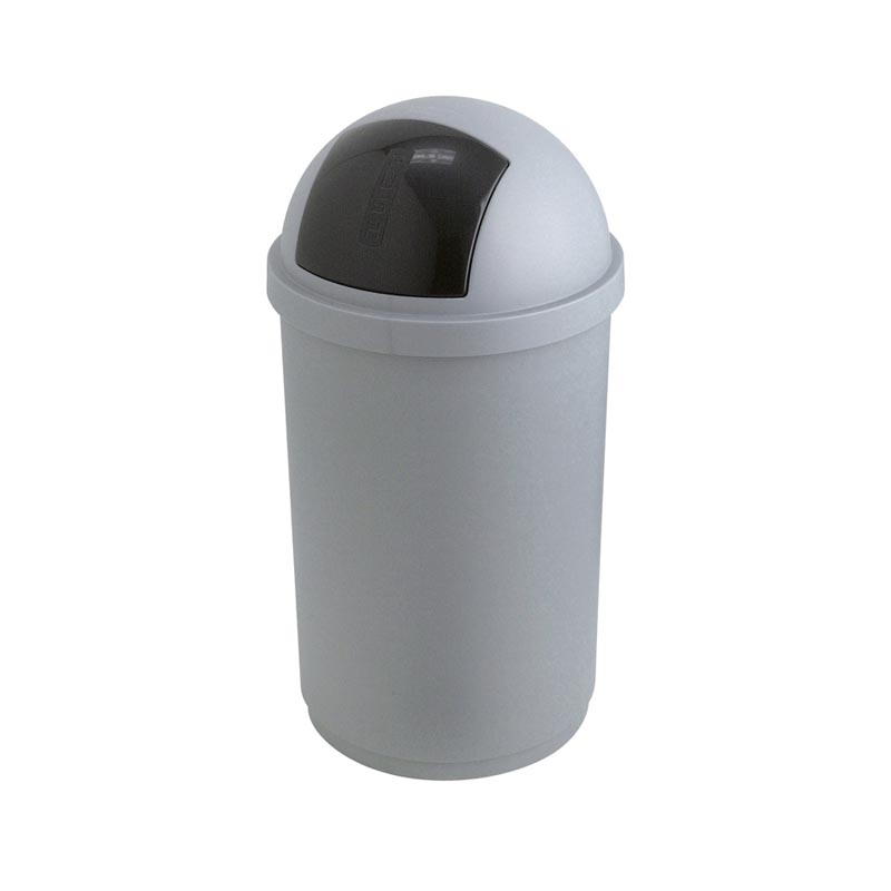 Kunststof afvalbak met ronde top en pushdeksel.