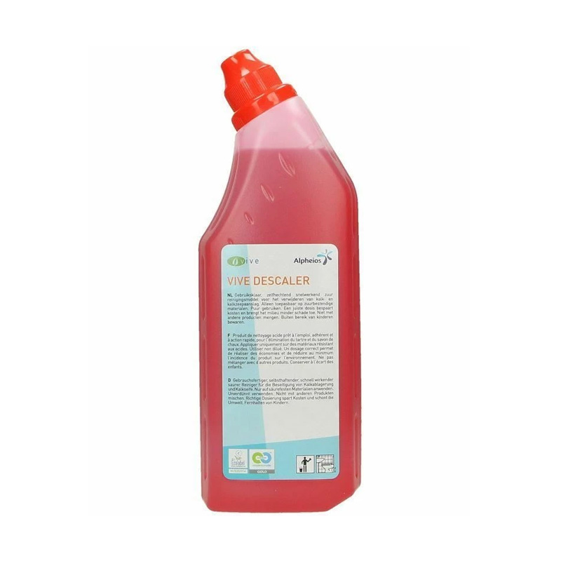 Ecologische ontkalker. Zelfhechtend snelwerkend zuur reinigingsmiddel voor het verwijderen van kalk- en kalkzeepaanslag. Vive® Descaler is licht geparfumeerd en laagschuimend. Vive® Descaler is uitermate geschikt voor verticale vlakken, bijv. toiletpotten en urinoirs, maar ook voor tegelwanden in sanitaire units, zwembaden en douches. Vive® Descaler hecht aan verticale vlakken en kan daardoor langer inwerken. Vive® Descaler is ook geschikt voor het verwijderen van cementsluier. Alleen toepassen op zuurbestendige materialen en niet gebruiken op kalkhoudende steensoorten zoals marmer en travertin.