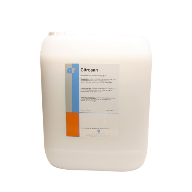 Citrosan is een synthetisch reinigingsmiddel voor universele toepassing met een krachtige citronella parfum. Citrosan is mild voor huid en materialen. Citrosan is een neutrale allesreiniger die synthetische emulgatoren en extra reinigende componenten bevat.