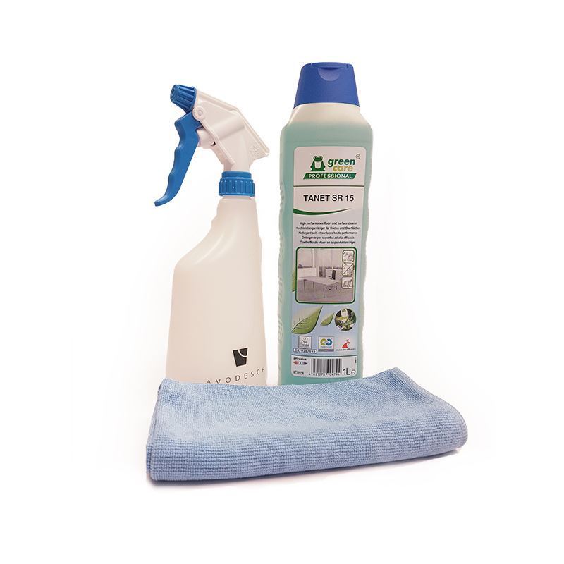 - Een interieurreiniger inclusief sprayflacon en microvezeldoek. Bekijk hier het filmpje voor het juiste gebruik daarvan.