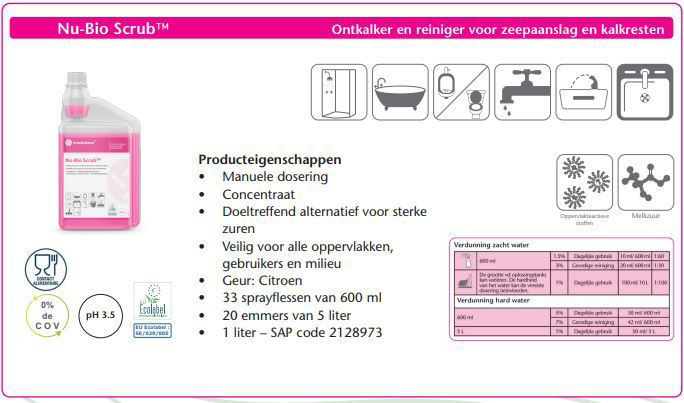 Nu-Bio Scrub is een geconcentreerde reiniger die oppervlakken reinigt en zeepresten en kalkresten verwijdert. Het elimineert ook vieze geurtjes en voorkomt verstoppingen in afvoeren en leidingen. Het belangrijkste actieve ingrediënt van Nu-BioScrub wordt geproduceerd via een biotechnologisch proces waarbij melkzuurfermenterende bacteriën betrokken zijn.