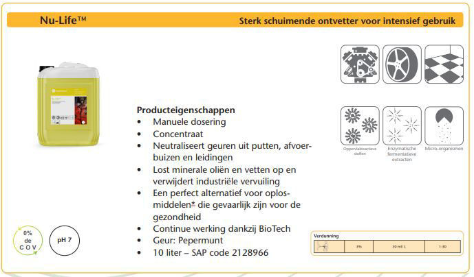 Nu-Life is een geconcentreerde schuimende ontvetter die minerale oliën, vetten oplost en industriële bodemophopingen verwijdert. Neutraliseert de sterke stank van putten, afvoeren en leidingen. Vervangt het gebruik van alle soorten oplosmiddelen.