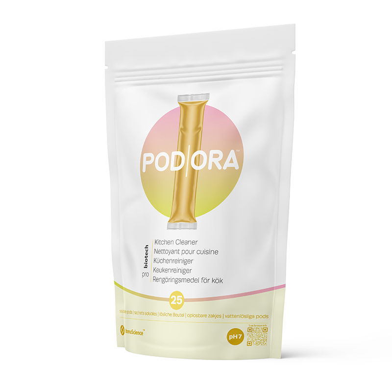 PodOra™ is een innovatief assortiment geconcentreerde biotechnologische reinigingsmiddelen in oplosbare pods die gemakkelijk te verdunnen en zeer effectieve reinigingsoplossingen bieden. Met een kleinere verpakkingsvoetafdruk en een supergeconcentreerde formule is PodOra™ de slimme keuze voor bedrijven die op zoek zijn naar veilige en duurzame schoonmaakoplossingen.