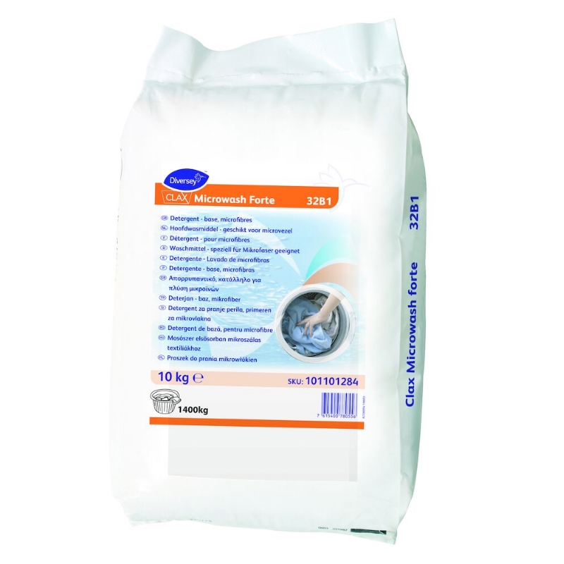 Clax Microwash forte Pur-Eco wast microvezelartikelen zoals poetsdoeken en moppen effectief, terwijl de microvezelstructuur van de doek en daarmee de reinigingsprestatie van de doeken in goede staat blijft. De ingrediënten in Clax Microwash forte Pur-Eco zijn zo gekozen dat ze voldoen aan de eisen van de fabrikanten van het microvezelmateriaal. Clax Microwash forte Pur-Eco kan ook worden gebruikt voor gekleurde artikelen, omdat het geen bleekmiddel bevat. Clax Microwash forte Pur-Eco is een enzymatisch waspoeder, op basis van effectieve oppervlakteactieve stoffen, waterhardheidsbinders, antivergrijzings- en anticorrosiemiddelen. Het uitgebalanceerde mengsel van oppervlakteactieve stoffen resulteert in een uitstekende verwijdering van vet/olie en deeltjes en in de verspreiding van bodemcomponenten. Het op fosfaat gebaseerde bouwsysteem zorgt voor een lage ionenconcentratie in de waterhardheid en voorkomt daarmee het neerslaan van wasmiddelcomponenten. Fosfaten fungeren tevens als antivergrijzingsmiddelen door bodemdeeltjes in suspensie te houden (voorkomt herafzetting). Daarnaast zijn er nog andere ingrediënten met anti-herafzettingseigenschappen in het product opgenomen.