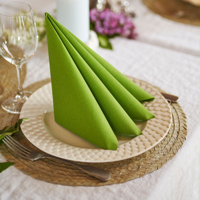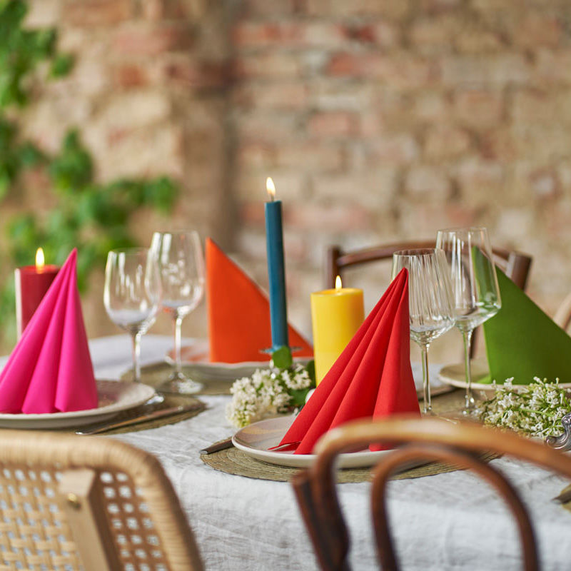 Royaal formaat en uiterst sfeervol. Optimaliseer de beleving van uw gasten, maar ook de hygiëne en het gebruiksgemak. Heerlijk zacht, voor kleurrijke momenten. Sterk absorptievermogen, gaat de hele maaltijd mee. Optimale balans tussen kosten en prestaties voor informele gelegenheden. Composteerbaar.