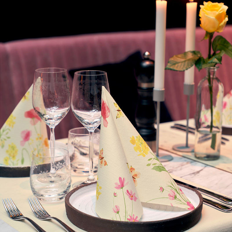 Royaal formaat en uiterst sfeervol. Optimaliseer de beleving van uw gasten, maar ook de hygiëne en het gebruiksgemak. Heerlijk zacht, voor kleurrijke momenten. Sterk absorptievermogen, gaat de hele maaltijd mee. Optimale balans tussen kosten en prestaties voor informele gelegenheden.