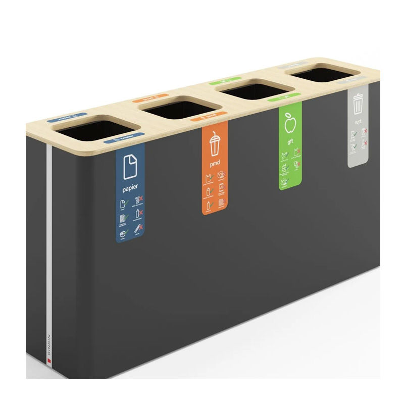 De Globular 4x90 is grootste Afvalbak uit ons assortiment. Dit afval scheiden op groot formaat, bijvoorbeeld in een kantine, openbare ruimte of foyer. De Globular kenmerkt zich door een toegankelijk tijdloos en sportief design. De Globular is een Afvalbak om in het zicht te zetten. De bamboe hoed maakt de Afvalbak fris en natuurlijk. De 90L uitvoering is speciaal ontworpen om inzetbaar te zijn voor alle werksferen waar een behoefte is aan een bak met een grote capaciteit. De Globular 4x90 is volledig modulair, daarom kan jij hem samenstellen zoals jij wilt. De accessoires (te zien op de productfoto) dienen apart bijbesteld te worden.