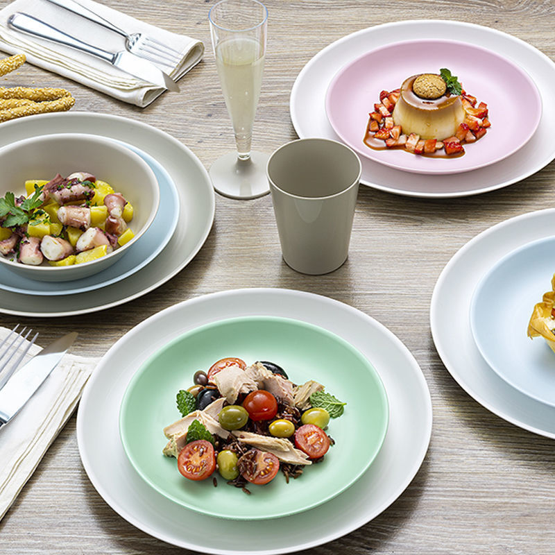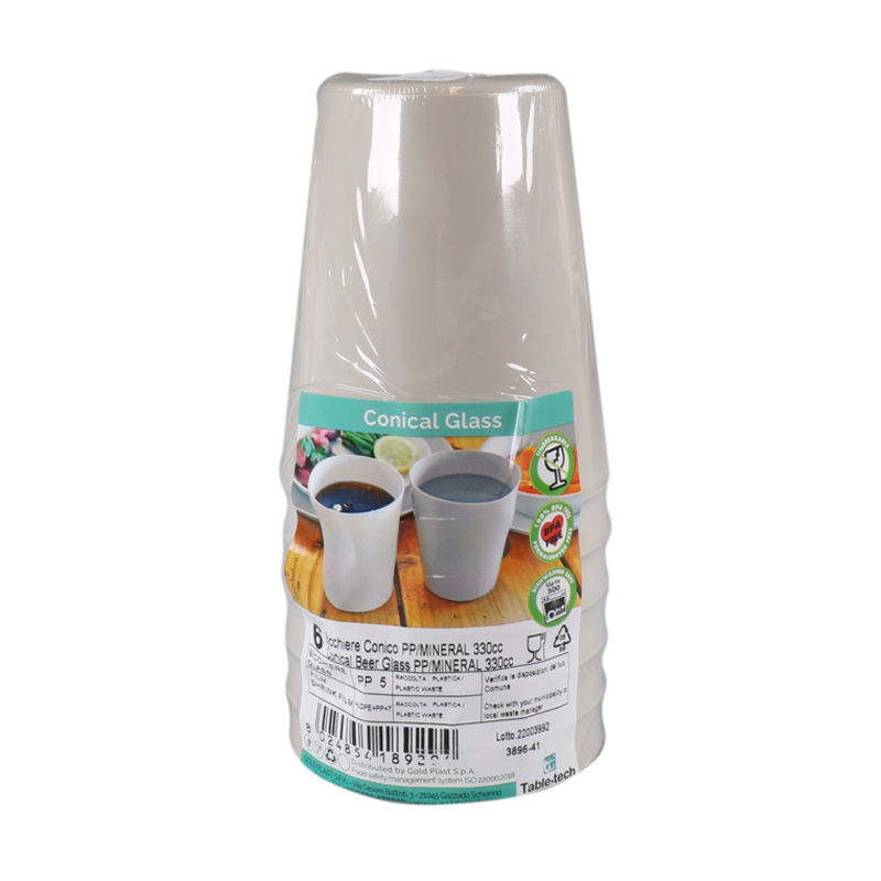 De ‘reusable’ servieslijn van Goldplast bestaat uit borden, schalen, bekers en glazen in diverse uitvoeringen en formaten. Alle producten zijn gemaakt van stevig glanzend kunststof en veelvuldig opnieuw te gebruiken. Met hun chique en toch eigentijdse design zijn ze een ideale keuze voor horecazaken, cateraars en bedrijven. En ook bij festivals, evenementen en andere feestelijke gelegenheden zorgt dit prachtige servies voor een verzorgde tafeldecoratie met volop allure. De herbruikbare bekers hebben een inhoud van 330 ml en worden per zes stuks geleverd.