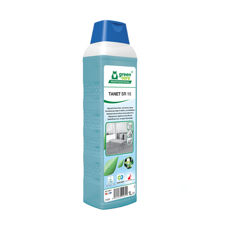 Krachtige vloer- en oppervlakkenreiniger met uitzonderlijke milieu-eigenschappen. Respecteert de biologische cycli en draagt zorg voor de gezondheid en veiligheid van het schoonmaakpersoneel. Verbetert de arbeidsveiligheid en de buitengewone kracht van TANET SR 15 garandeert uitstekende presta ties met minimale inspanningen en kosten. Het uitstekend bevochtigingsvermogen garandeert een makkelijke en grondige verwijdering van vuil en vet van poreuze stenen vloeren en zelfs van hydrofobische oppervlakken zoals PUR, zonder vegen of aanslag.