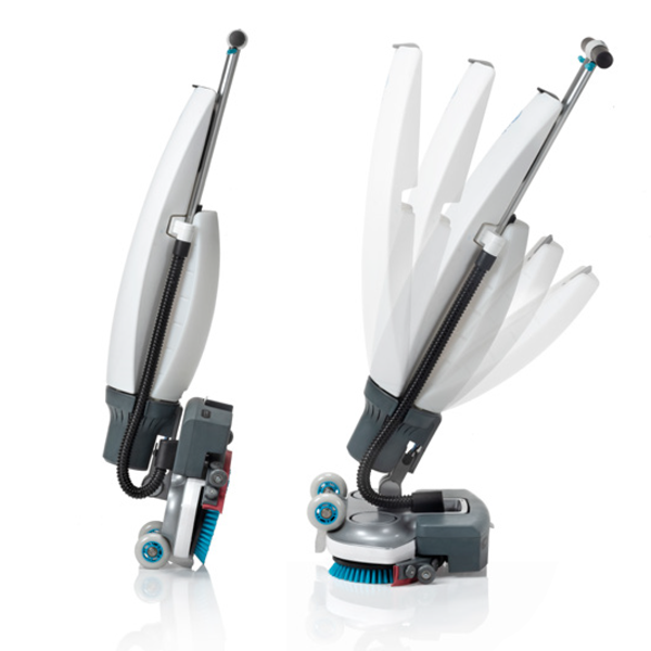 De imop® Lite heeft een schrobzuigervoet met twee supersnelle borstels en een werkbreedte van 46 cm, die een ongeëvenaarde wendbaarheid biedt. Dankzij de twee tegen elkaar in draaiende borstels kunt u de machine soepel bedienen, zelfs met één hand. Maakt rond en onder objecten schoon, net als een dweil.