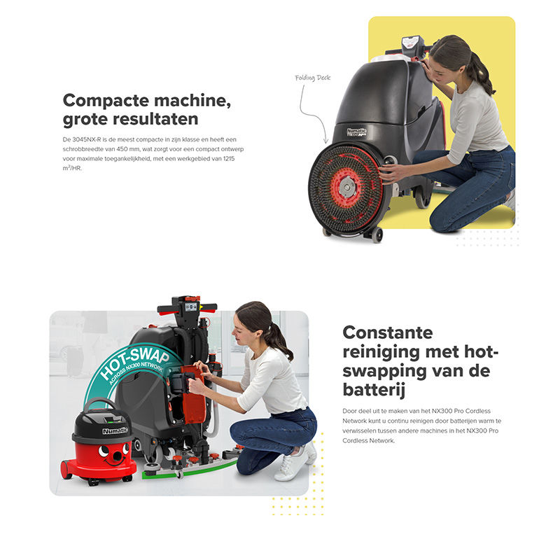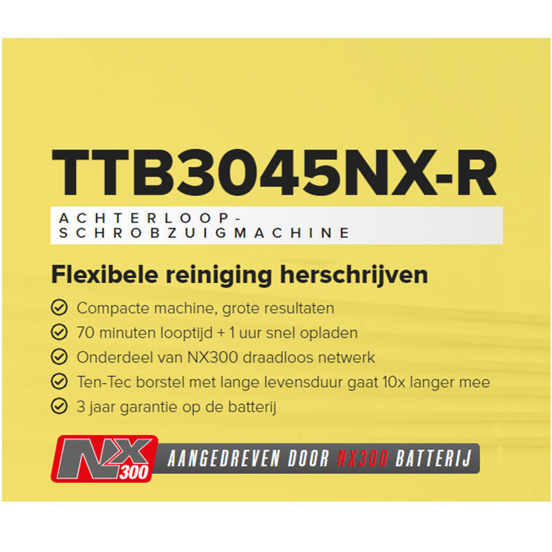 De NX300 batterij is gemaakt voor de lange termijn en laat u niet in de steek, ontworpen en getest voor commercieel gebruik en levert tot 2500 oplaadcycli. Een batterijgarantie van 3 jaar zorgt voor volledige gemoedsrust. De bedieningselementen en onderdelen die aandacht vergen bij het reinigen van de machine zijn rood gekleurd.