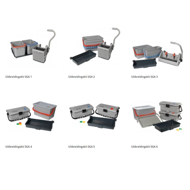 Standaard wordt de werkwagen SCG 1405 geleverd met twee 5 liter zwenkemmers en een afvalunit van 120 liter. Met de aanwezige kleuraccenten kan je eenvoudig schoon en vuil van elkaar scheiden. De SCG werkwagenserie van Numatic is naar wens aan te kleden met de verschillende kits.