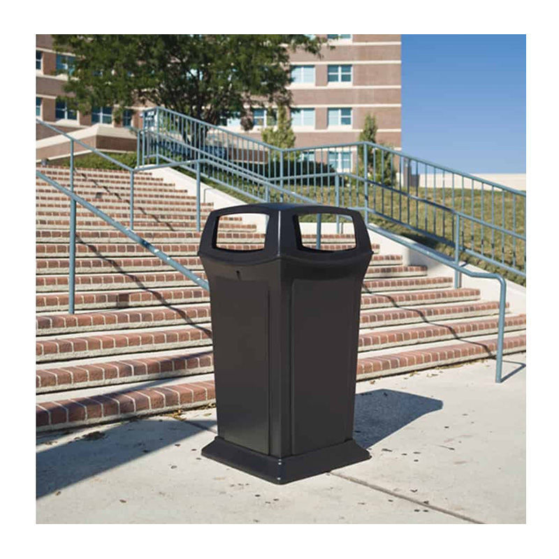 Afvalbeheer met hoge capaciteit. Ontworpen voor stadions, parken, winkelcentra en andere gebieden met veel verkeer. Permanent bevestigd scharnierend deksel voor eenvoudig legen. Voetstuk basisring voor stabiliteit en veiligheid.