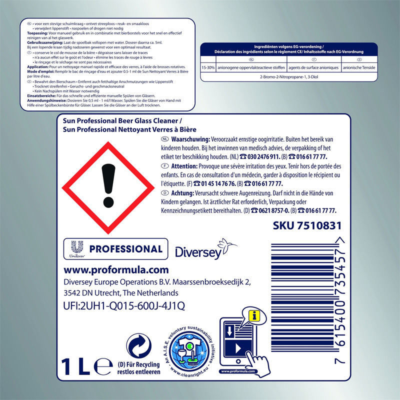 Sun Pro Formula Bierglasreiniger is goedgekeurd door Unilever’s Safety and Environmental Assurance Centre (SEAC) als zijnde veilig in gebruik, indien toegepast overeenkomstig de gebruiksaanwijzing.
