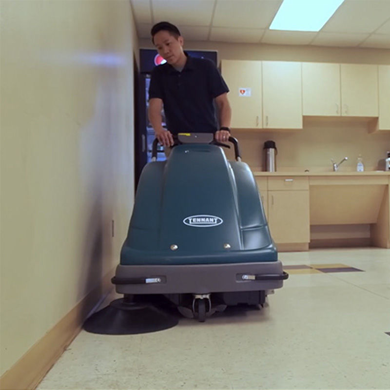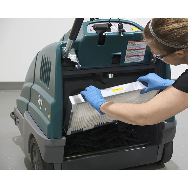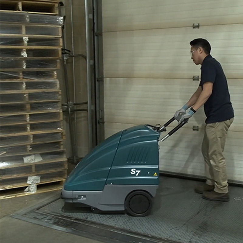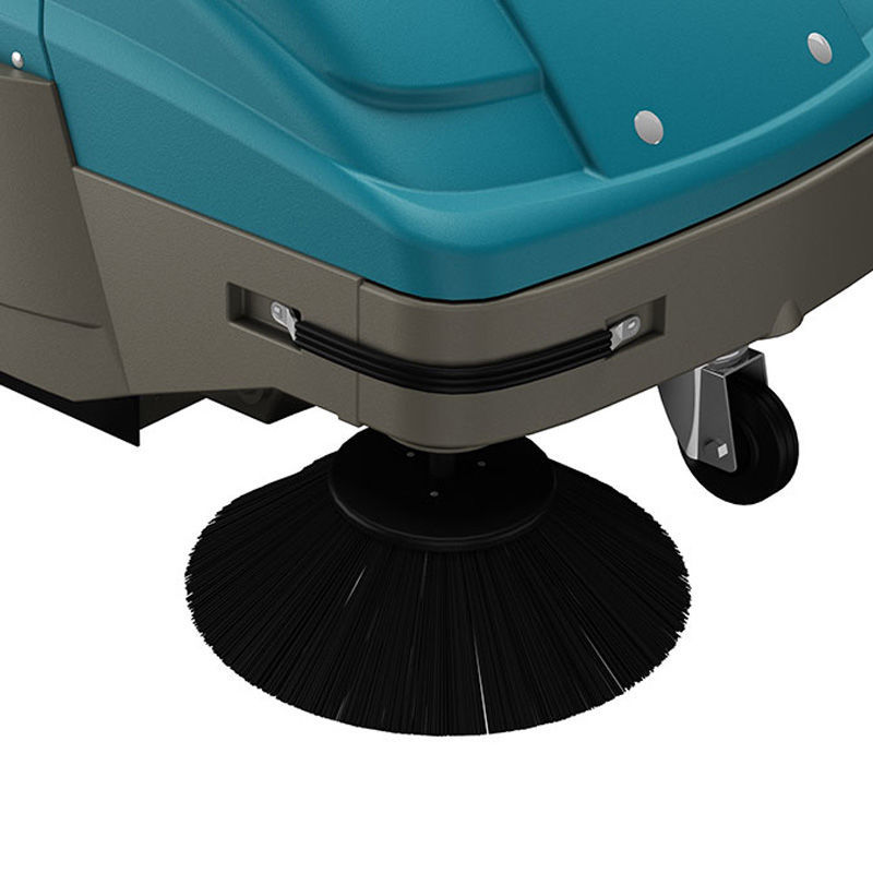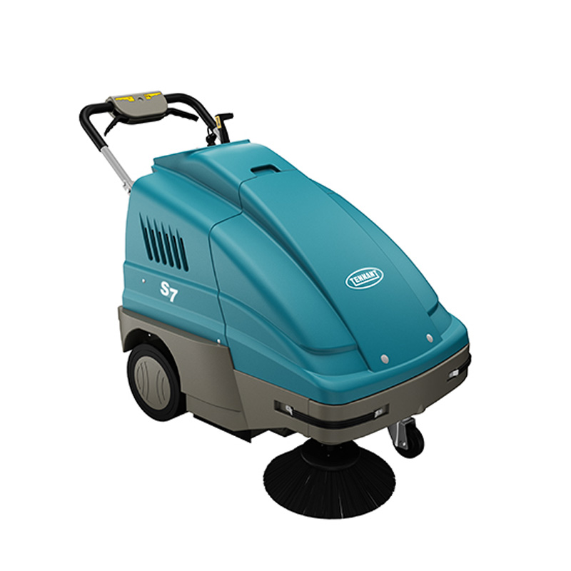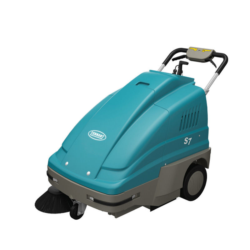 De Tennant S7 is een veelzijdige handgeleide achterloop veegzuigmachine met aandrijving 105 Ah gel batterijen, ingebouwde lader, polypropyleen borstels, rechter zijborstel voor het reinigen van zowel harde vloeren als tapijtvloeren.