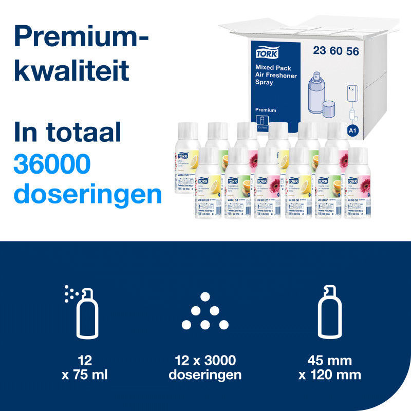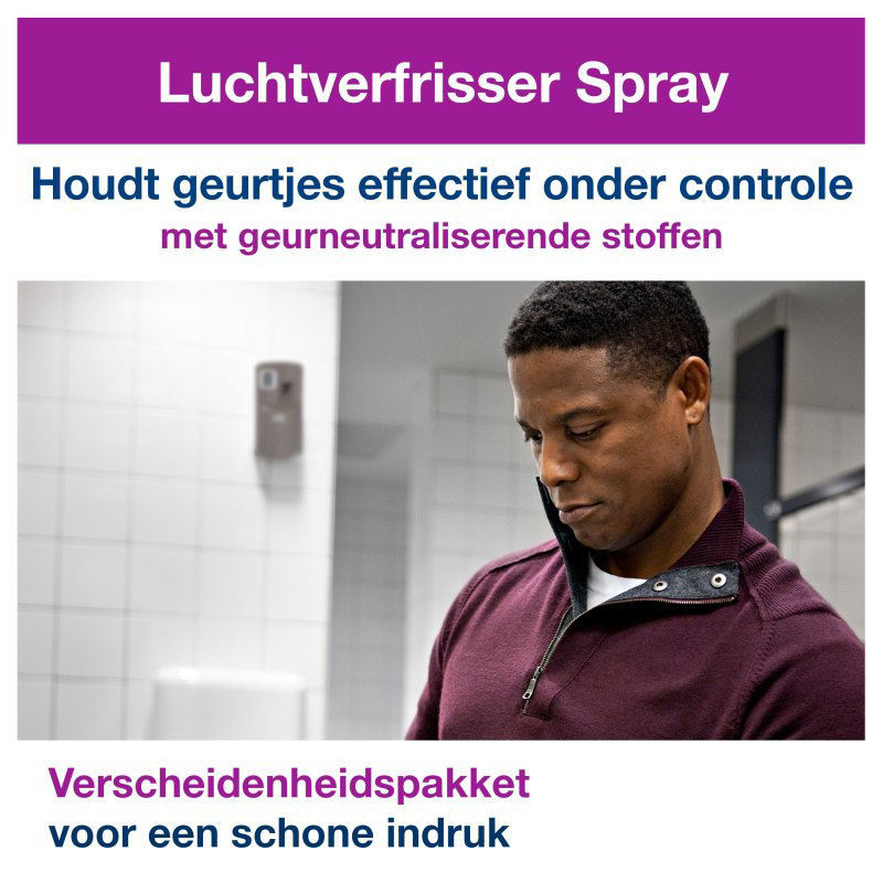 Houd onaangename geurtjes in de sanitaire ruimte effectief en efficiënt in toom met het luchtverfrisserspraypakket met verschillende geuren. De spray bevat geconcentreerde geuroliën en gepatenteerde middelen die geur neutraliseren. Zo rekent u af met onaangename geuren en kunt u een langdurig frisse lucht bieden. De sprays zijn geschikt voor de Tork Luchtverfrisser Spray Dispenser.