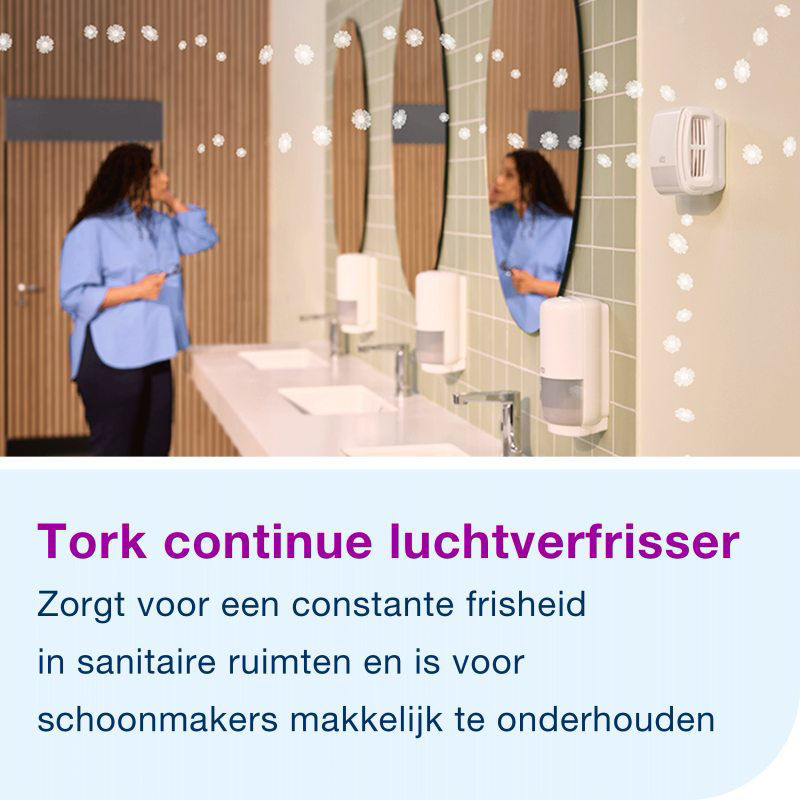 Tork Constante Luchtverfrisser Lentebries en Bloesem houdt de sanitaire ruimte constant fris. Lentebries biedt bloemen-, yang- en houtachtige aroma’s voor een frisse bries, en Bloesem bevat delicate bloemenaroma’s voor een warme, verwelkomende geur. Beiden met geurneutralisatie. Geschikt voor Tork Constante Luchtverfrissing Dispensers, die bewezen gebruiksvriendelijk zijn voor schoonmakers.