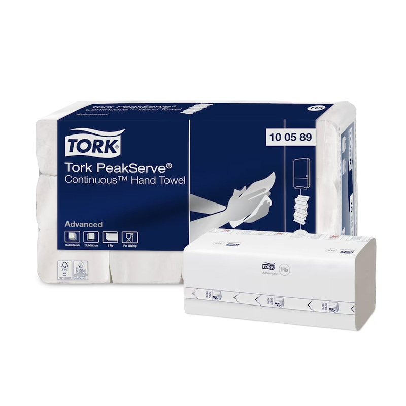 Verwen uw bezoekers met de Advanced Tork PeakServe® Handdoek. De handdoek droogt de handen goed en heeft een mooi grijs reliëf met embossing. Tork PeakServe®: de nieuwste innovatie die is ontworpen voor drukbezochte sanitaire ruimtes waar schoonmaakpersoneel de schoonmaaktijd maximaal moet benutten en voor een goede doorstroming van mensen zorgen. Het systeem is compatibel met de Tork PeakServe dispenser en heeft een zeer grote capaciteit van meer dan 2100 handdoeken, die snel en zonder onderbreking kunnen worden uitgegeven. De gecomprimeerde vullingen kunnen snel en op ieder moment worden gevuld en zijn eenvoudig op te slaan en te vervoeren. Zo kan het personeel zich richten op de schoonmaak.