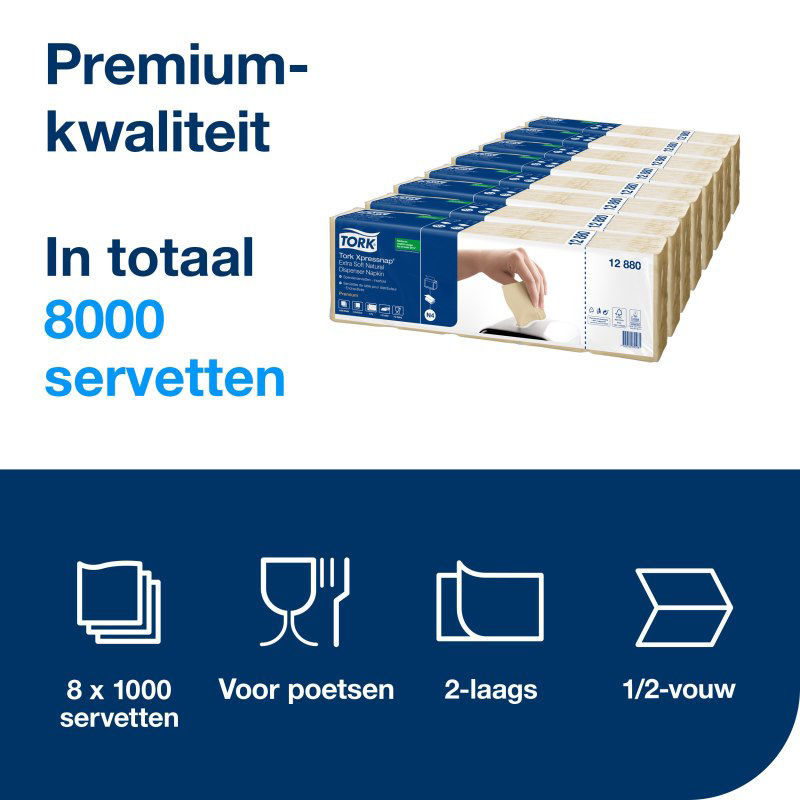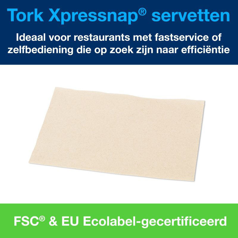 Tork Xpressnap® Premium Servetten zijn perfect geschikt voor zelfbedieningsrestaurants. Helpt uw gebruik van servetten met minstens 25% te verminderen in vergelijking met traditionele servetdispensers. Tork Xpressnap® Extra Zacht Dispenserservet naturel 2-laags zijn gemaakt van 100% gerecyclede vezels. Een uitstekende keuze als u wilt laten zien dat u om het milieu geeft.