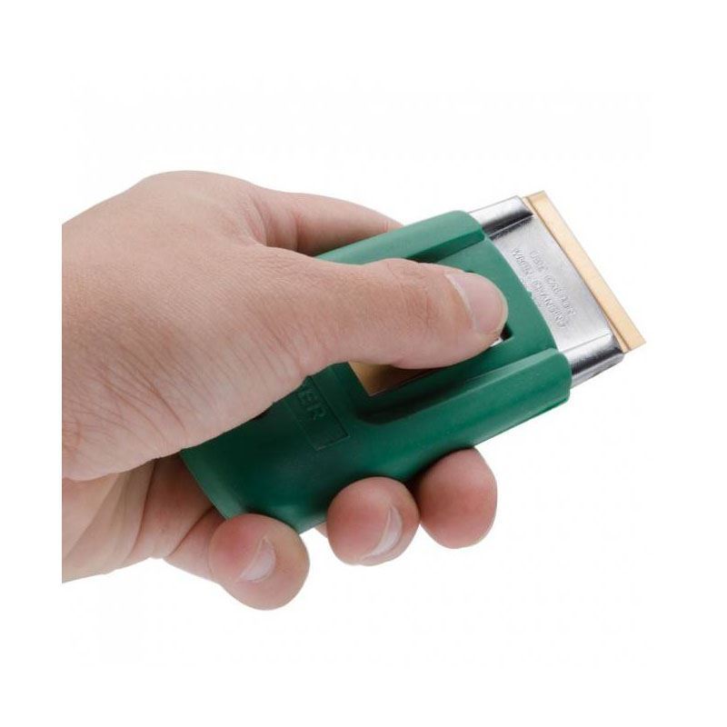 De ergonomische schraper met veiligheidsmechanisme en rubberen hoes.