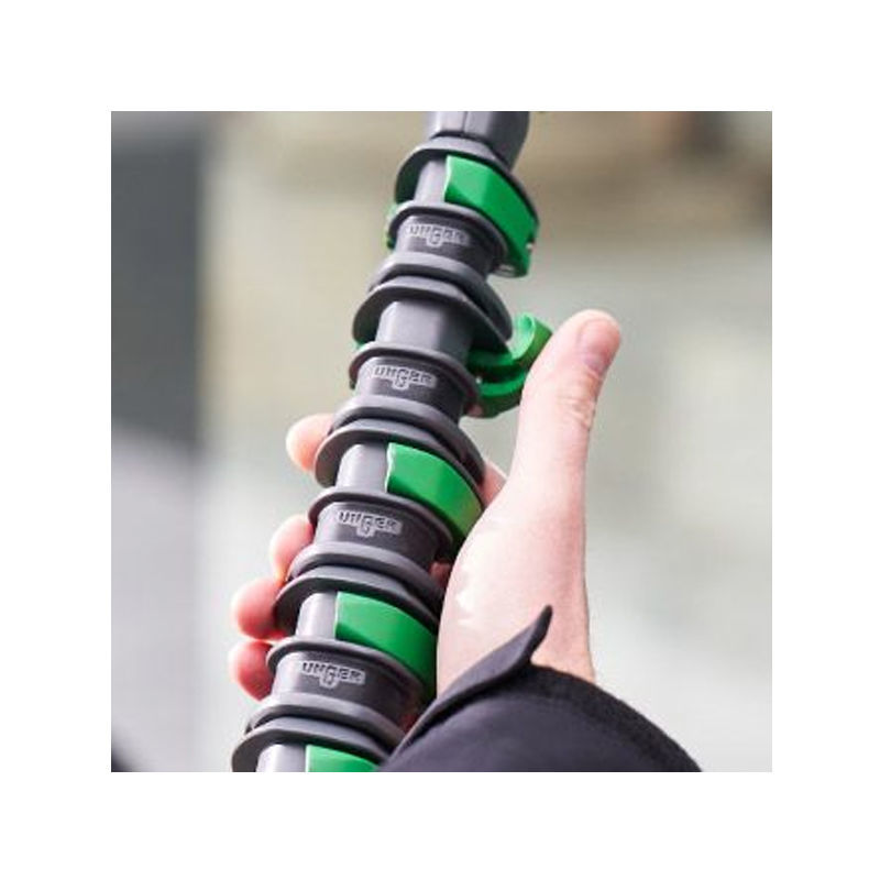 Voorbeeld 3: De DuroFlex slang. De watergeleidende stelen van UNGER beschikken over een intelligent slangmanagement, waardoor effectief reinigen met zuiver water wordt gegarandeerd. De zeer flexibele DuroFlex slang wordt door de telescoopsteel geleid en maakt zo ononderbroken en snel werken aan ramen en gevels mogelijk. Liever de slang aan de buitenkant van de steel? Geen probleem. Daarvoor zijn er de nLITE Clips. Die zorgen dat de slang direct en steeds langs de steel wordt geleid.