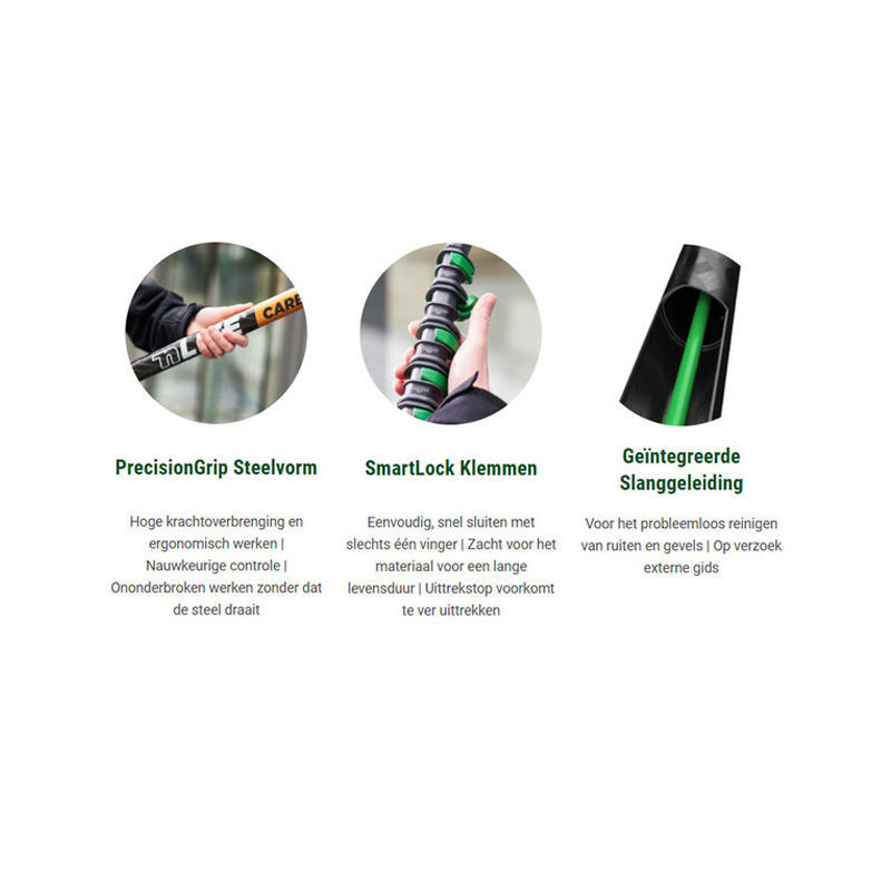UNGER heeft de watergeleidende telescoopstelen van het nLITE systeem tot het uiterste ontwikkeld. Intelligente product features zorgen voor een nauwkeurige controle van de schoonmaakbeweging en een enorme vermindering van de benodigde tijd en kracht. Wilt u een voorbeeld? SmartLock klemmen: dankzij deze kleine, maar fijne feature van de watergeleidende stelen van UNGER kan sneller worden gewerkt tijdens het reinigen met zuiver water. Vooral omdat er snellere en betere resultaten worden behaald bij het reinigen van delen van gebouwen met verschillende hoogtes. Met de SmartLock klemmen kunnen glazenwassers en gevelreinigers de afzonderlijke steelelementen eenvoudig en snel met slechts één vinger vergrendelen. Eenvoudiger bestaat niet. En met de geïntegreerde uittrekstop wordt voorkomen dat de steelelementen te ver worden uitgetrokken. Snel, nauwkeurig en veilig werken gegarandeerd - mede dankzij de DuroFlex slang van de UNGER nLITE Carbon Composite telescoopstelen. Door de geïntegreerde slanggeleiding en het zeer flexibele materiaal kan ononderbroken worden gewerkt aan ramen en gevels. Voor slanggeleiding aan de buitenkant van de steel zijn optioneel nLITE Clips verkrijgbaar. Het resultaat: optimale flexibiliteit en extreme efficiëntie bij professioneel reinigen met zuiver water.