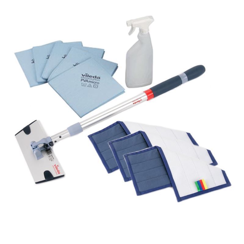 Met de Vileda interieurset configurator heeft u een complete oplossing voor de reiniging van deze oppervlakken, vooral daar waar standaard materialen niet voldoende en de opeervlakken lastig te bereiken zijn.