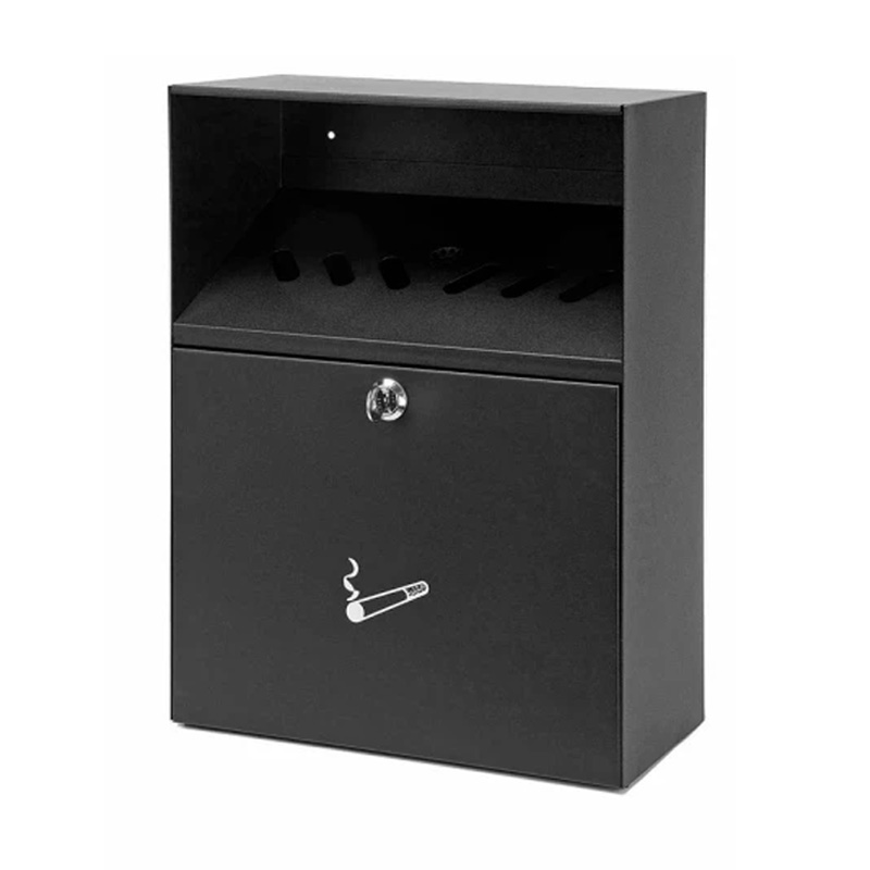 Wandasbak van RVS/gegalvaniseerd staal met metalen binnenemmer. Door middel van het slot aan de voorzijde kan de asbak worden geleegd.